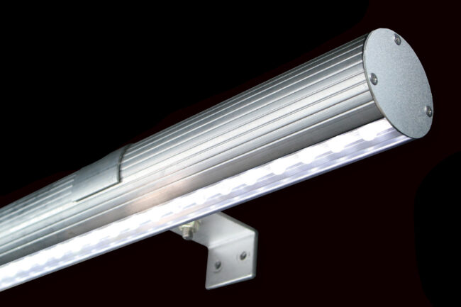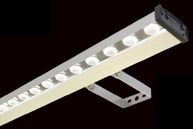 「スレンダーライトKAKU」は、照射角45度の集光レンズを使用した看板外照用のほか、間接照明やエクステリア照明にも使用できる角型でスタイリッシュなカーテンライトです。